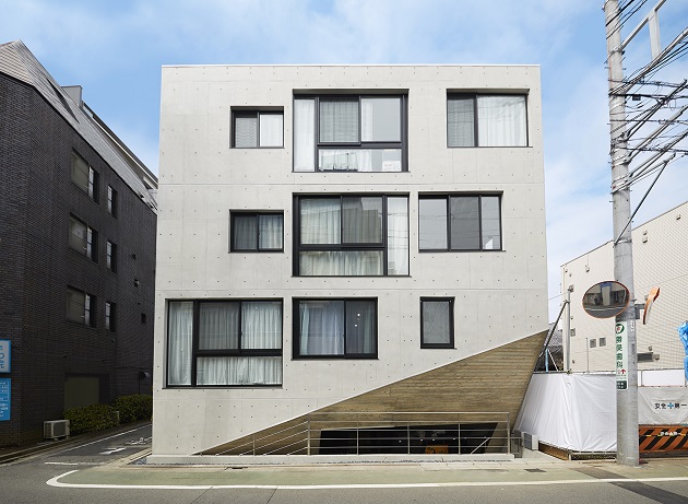 コンクリートの質感が感じられるスタイリッシュなファザード。ランダムに配置されたガラス窓が目を惹きます。